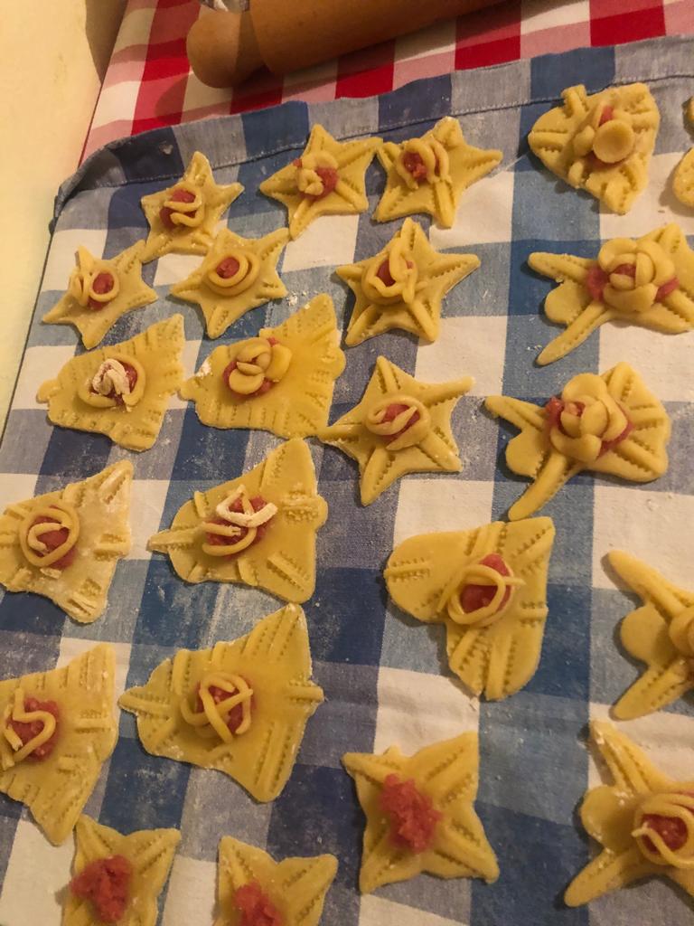 La pasta deve essere lavorata poco e rimanere morbida, va fatta riposare una mezz'oretta prima di iniziare la preparazione. Va stesa non troppo alta e si taglia con le formine di acciaio, si passa poi a fare le tipiche pinzettature ai bordi, mettere al centro del biscotto un cucchiaio di marzapane e si finsice decorandola a nostro gusto, con dei piccoli pezzetti di pasta.